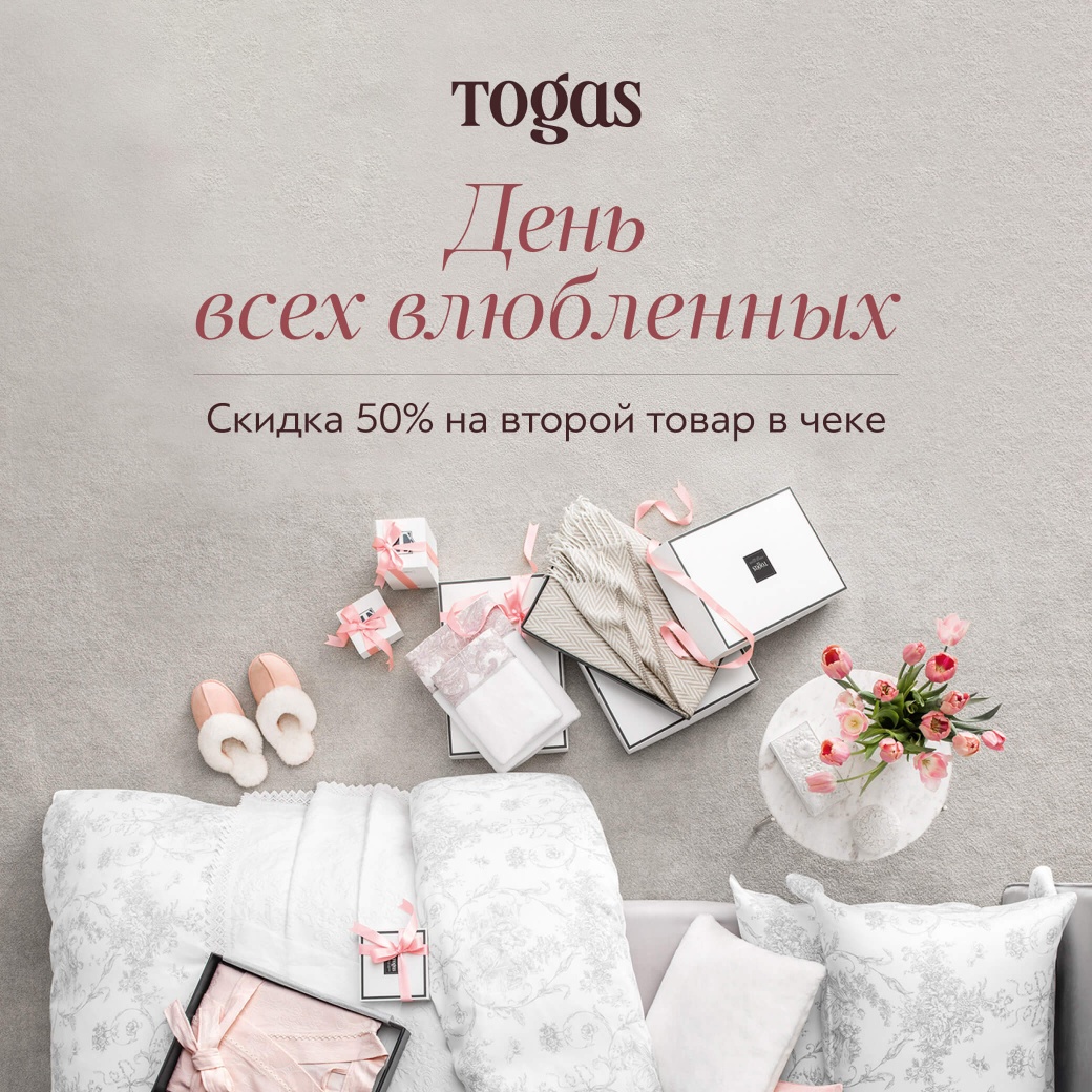 До 14 февраля в брендовых бутиках дома текстиля Togas вас ждет специальное предложение на постельное белье, подушки, одеяла, домашнюю одежду и декор для дома.